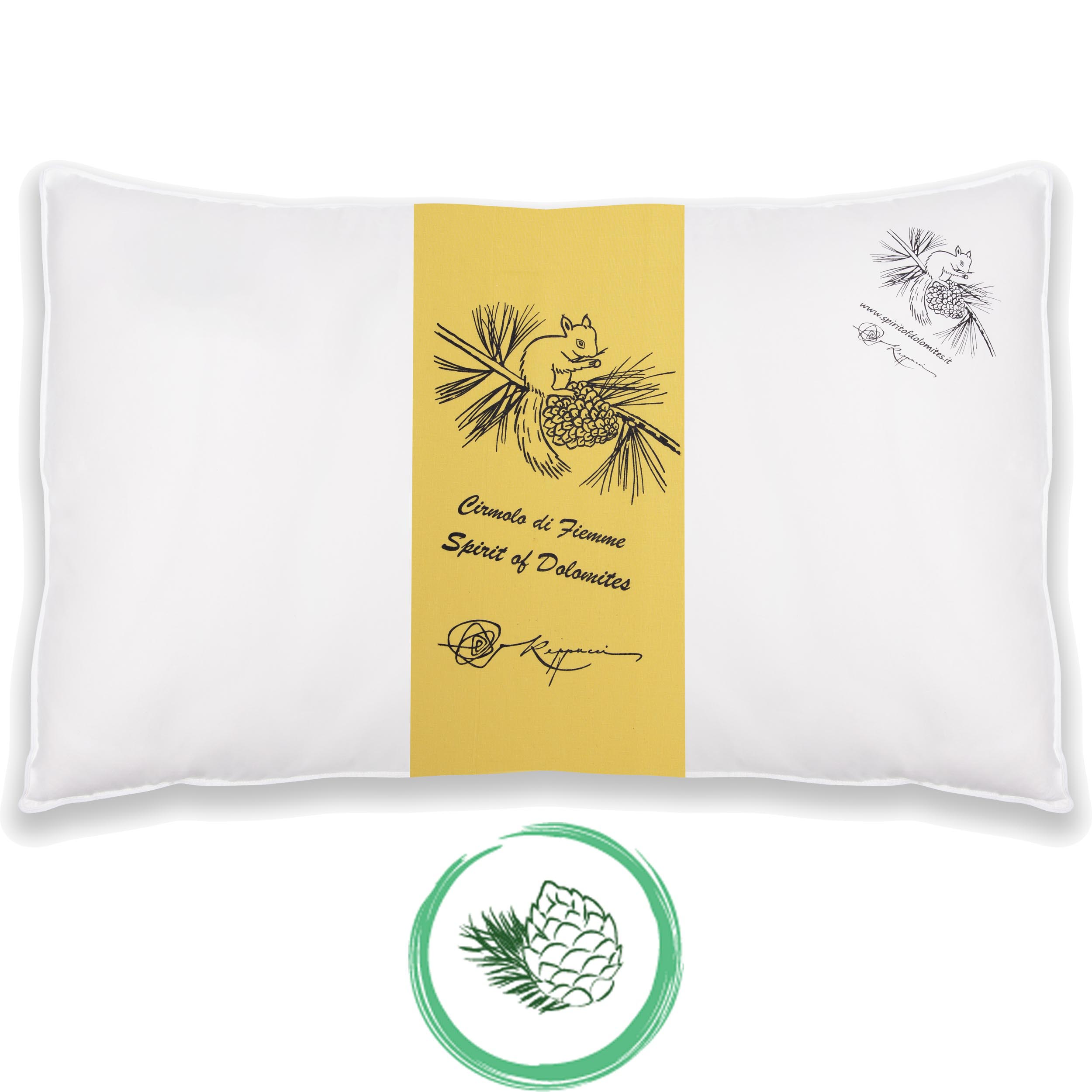 Consigliato per chi vuole un cuscino medio-basso, compatto e con il caratteristico fruscio dei trucioli, è composto da un sacco d contenete i trucioli di cirmolo inserito in un guanciale imbottito su un solo lato con falda di pura lana vergine.