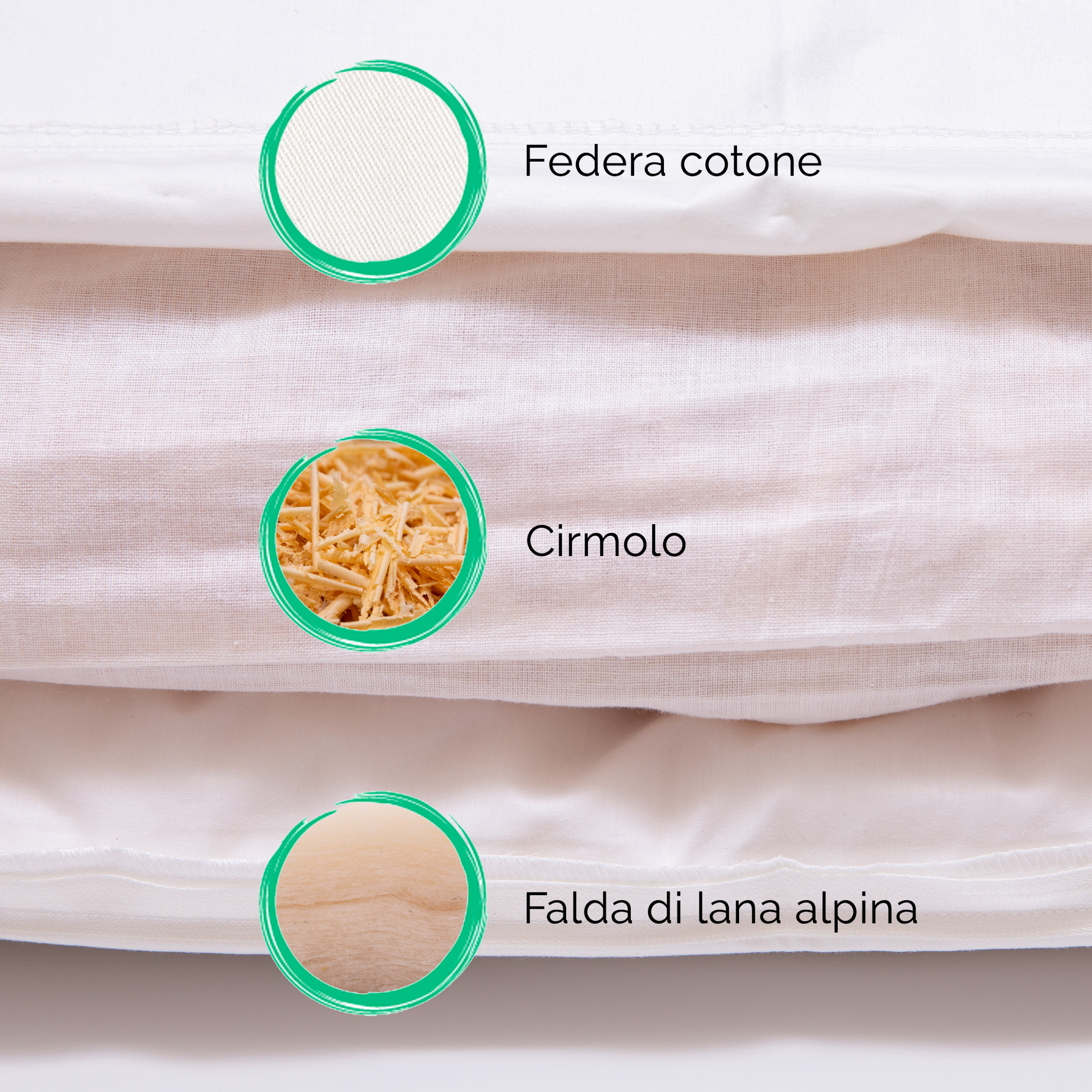 Lana alpina è l’imbottitura per eccellenza: fornisce un’ottima termoregolazione, favorisce la traspirazione e si distingue per la sua freschezza ed è indicata per chi soffre di allergie. Indicato per chi soffre di insonnia, ansia e depressione, previene i reumatismi e allevia i disturbi respiratori. I fiocchi vengono realizzati impiegando Lana Dolomiti, ottenuta unicamente da pecore dei pascoli alpini italiani.