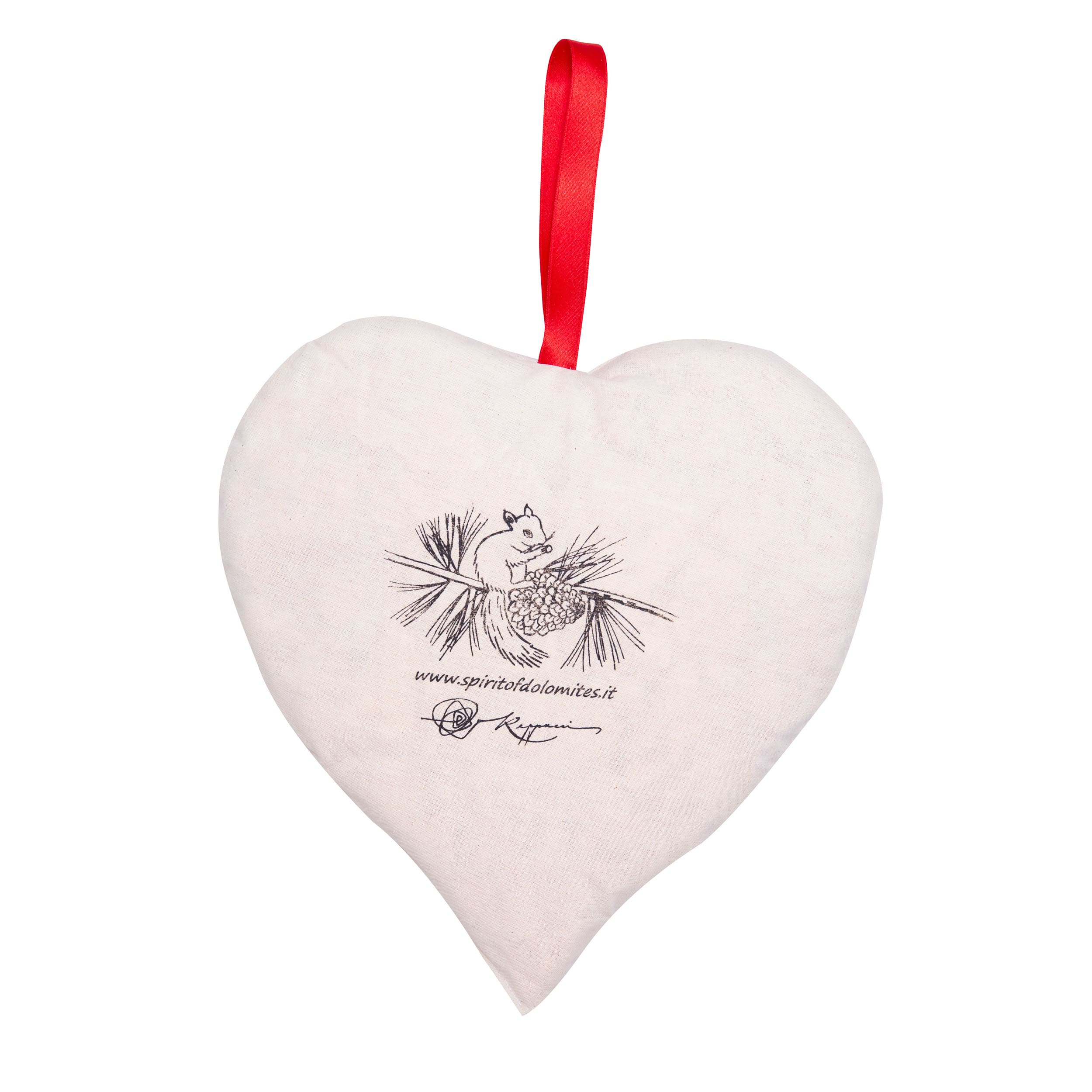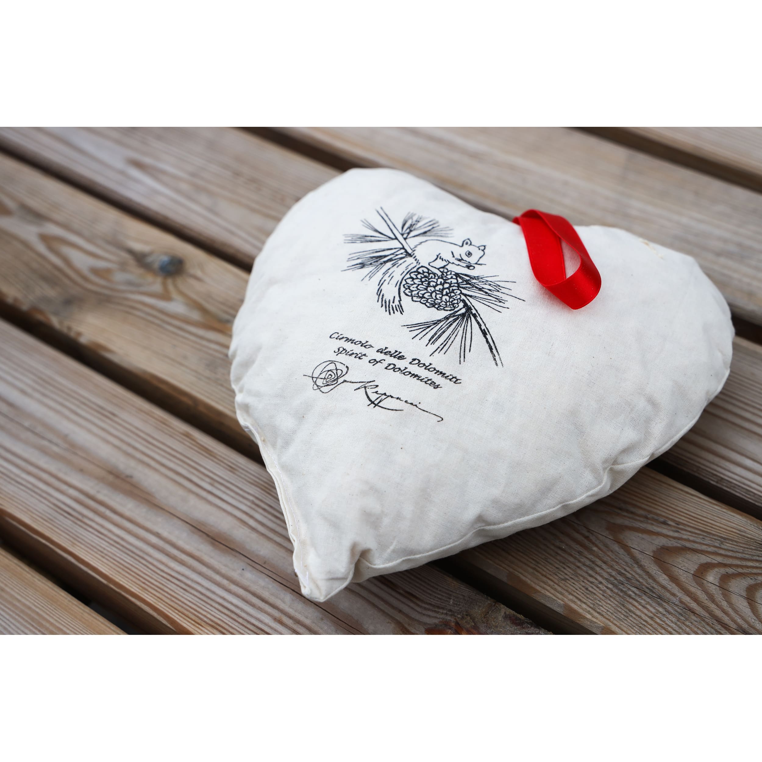 Cuscino a forma di cuore con imbottitura di trucioli di cirmolo (100%). Federe 100% cotone. Dimensioni diagonale cuore 25 cm. Ottimo come regalo e per profumare gli ambienti.