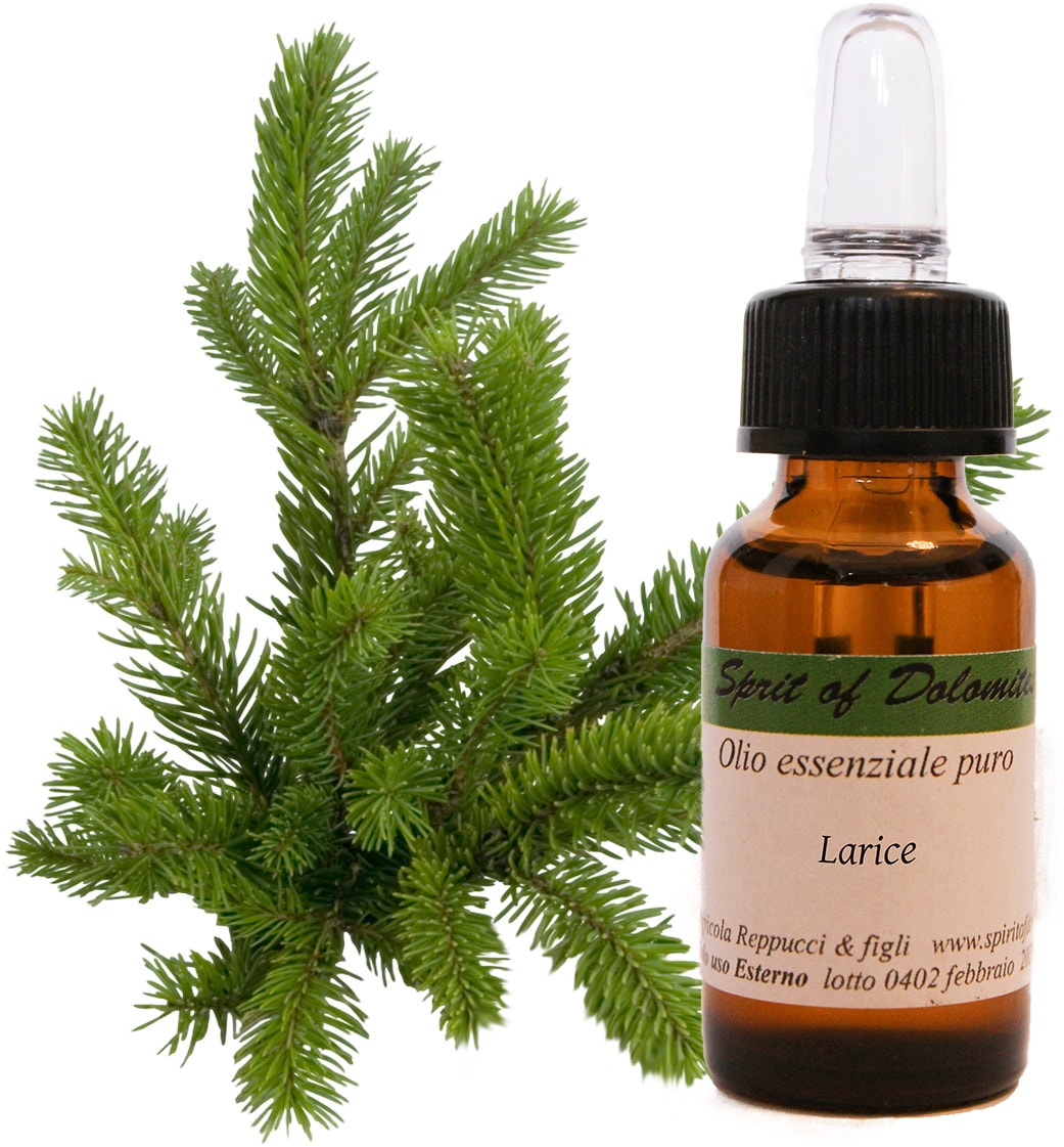 Olio essenziale puro al 100% di larice (10ml). Ottimo purificatore degli ambienti, contrasta tosse e mal di gola.