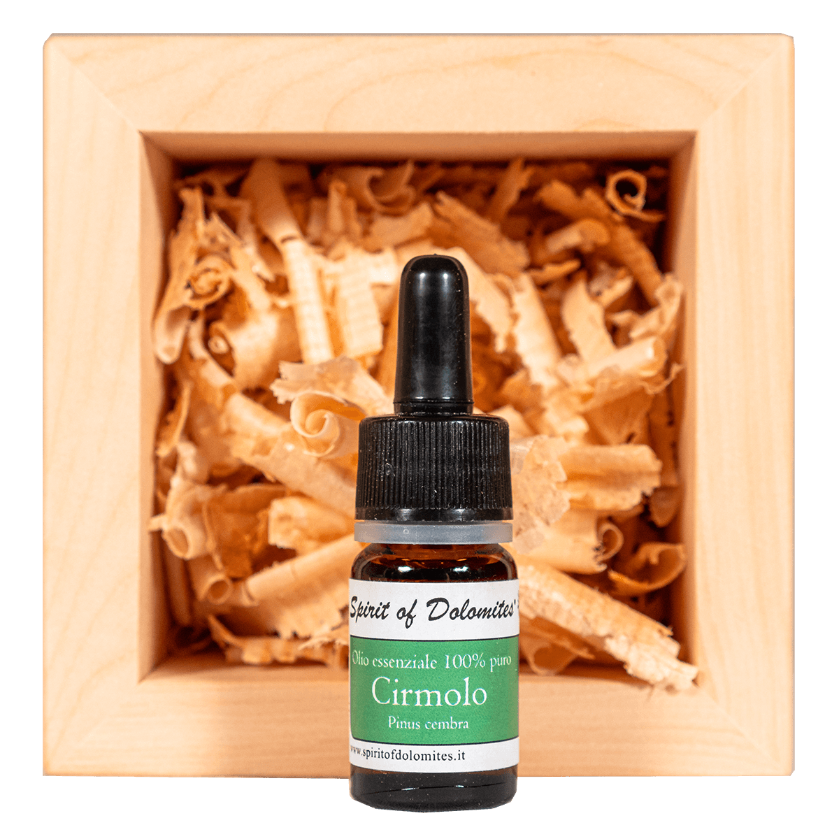 Scatola in legno di cirmolo, riempita con pregiati trucioli di pino cembro. La confezione contiene un olio essenziale di cirmolo da 5ml.