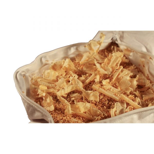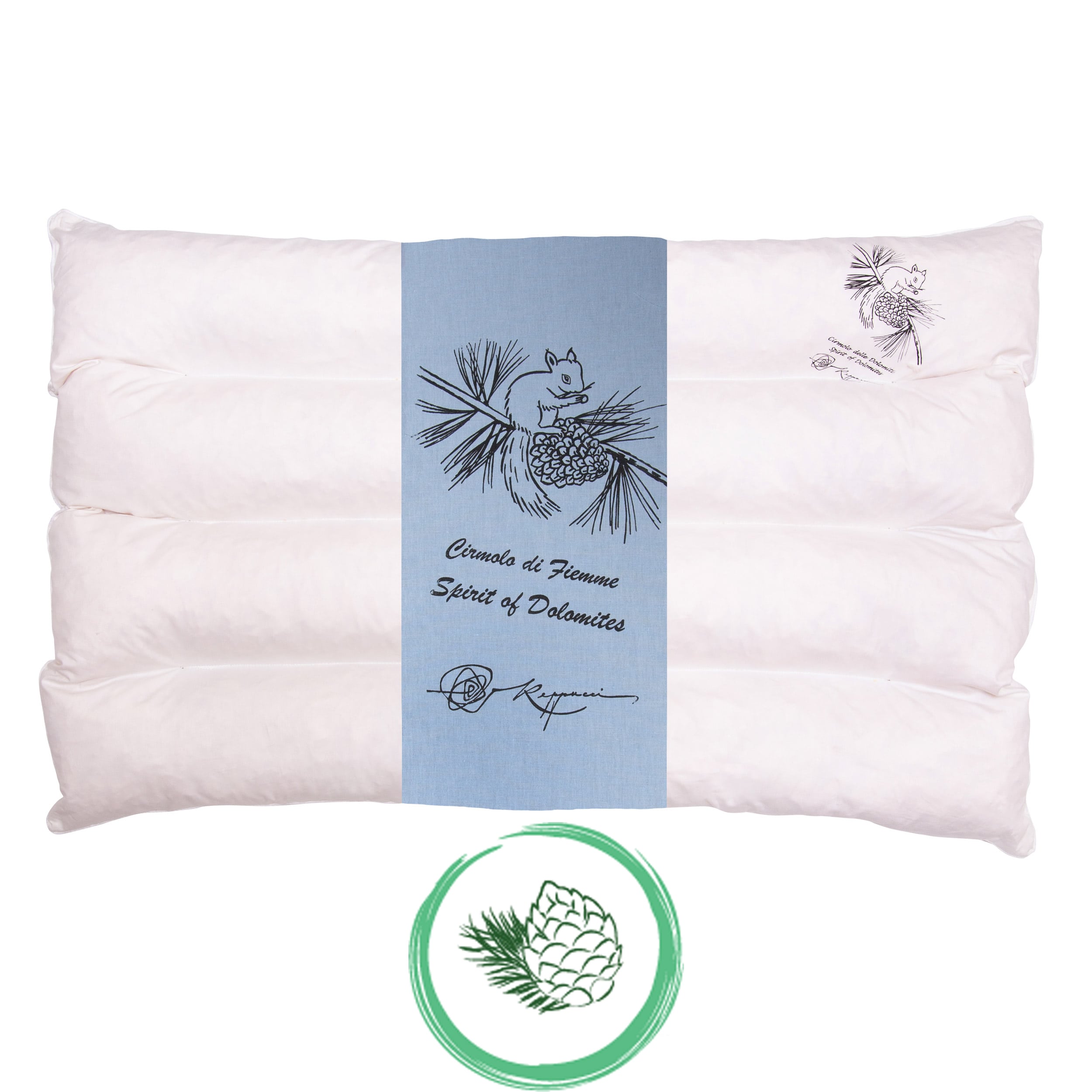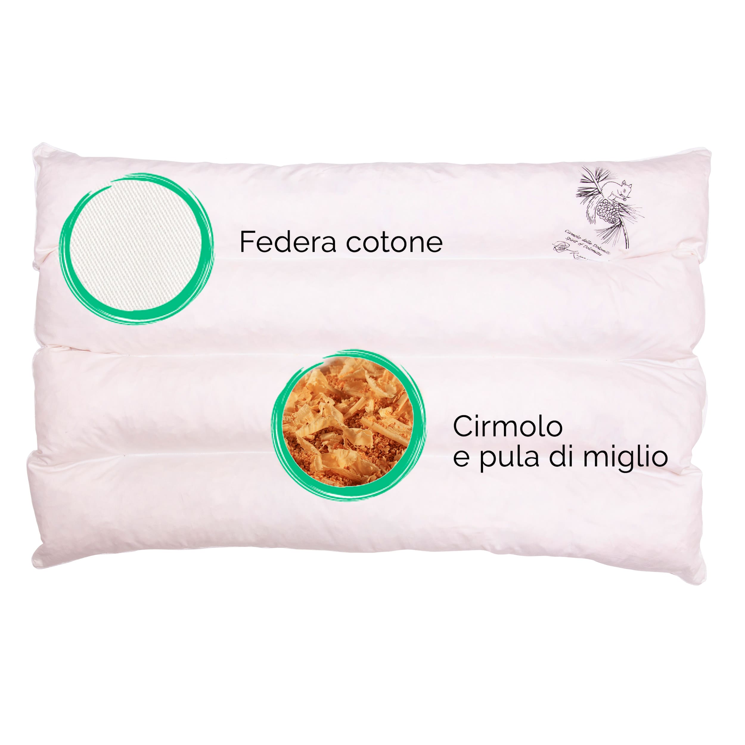 Guanciale con imbottitura in trucioli di cirmolo (50 % ca.) e pula di farro biologica (50 % ca.). Federa 100 % in cotone. Dimensioni 80×50 cm. Consigliato per chi vuole un cuscino per lenire i dolori cervicali.